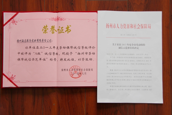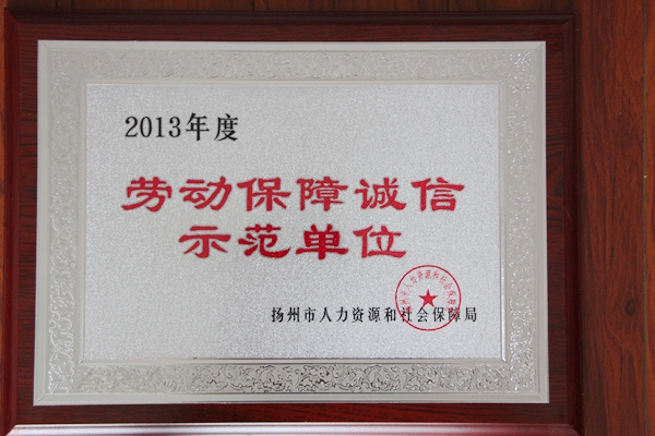 ? ? 近日,揚(yáng)州海昌榮獲“2013年度勞動(dòng)保障誠信示范單位”榮譽(yù)稱號,這是揚(yáng)州海昌自2012年試運(yùn)行以來首次獲此榮譽(yù)。