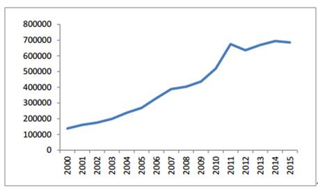 2000-2015年工業(yè)廢氣排放總量(億立方米)