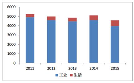 2011-2015年工業(yè)與生活端廢氣排放(億立方米)