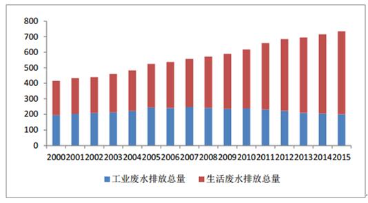 2000-2016年全國(guó)廢水排放結(jié)構(gòu)(億噸)