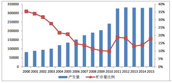 2000-2015年工業(yè)固廢產(chǎn)生量及貯存量比例(萬(wàn)噸,%)
