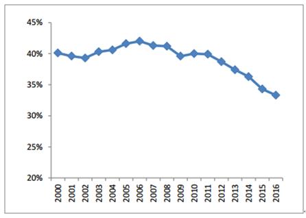 2000-2016年工業(yè)占GDP比重